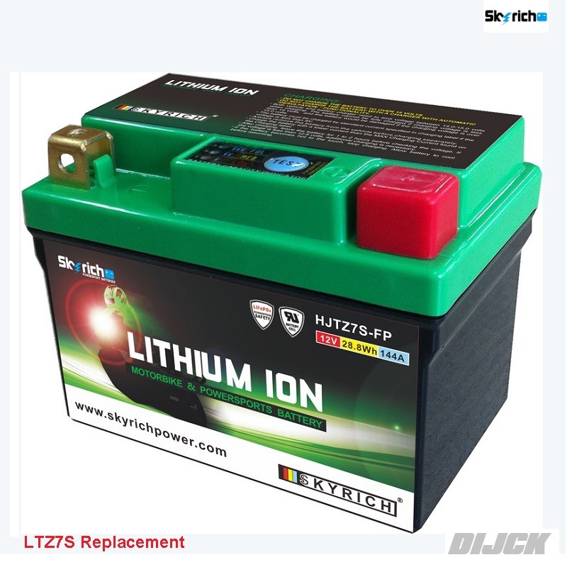 SKYRICH Accu HJTZ10S-FP (LTZ10S) LION SLitium ION AccuMaten:Lengte: 15 cmBreedte: 8,7 cmHoogte: 9,3 cmSpecificaties van de SKYRICH lithium accu: - Ter vervanging van uw huidige motoraccu en geheel onderhoudsvrij. - Installatie in elke positie, zelfs ondersteboven. - Ideaal voor gebruik in race motoren door het extreem lage gewicht: tot 77% lichter dan een loodaccu. - Langere levensduur t.o.v. loodaccu's: Lithium acu's hebben geen last van sulfatering. - Tot 60% meer startvermogen dan conventionele accu's. - Snellading mogelijk met speciale laadapparatuur tot 90% in 6 minuten. - Zeer geringe zelfontlading (max. 5% per maand) en kan daarmee makkelijke een winterstalling "overleven". - Ingebouwde led-controle : 3 led's = Spanning > 13,15V, batterij volledig geladen en klaar voor gebruik 2 led's = Spanning > 13V, batterij kan de motor starten maar wordt best geladen 1 led = Spanning < 12,8V, batterij moet geladen wordenSKU: HJTZ10S-FP, LTZ10SSHIDO LTZ10S