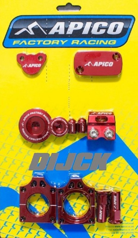 APICO Factory Bling Pack REDCRF250 09-17CONTENTS:- REAR AXLE BLOCKS - FRONT BRAKE MASTER CYLINDER COVER - REAR BRAKE MASTER CYLINDER COVER - ENGINE PLUGS - FRONT BRAKE HOSE CLAMP - VALVE CAPS - RIM LOCK NUTSBlingbling kit