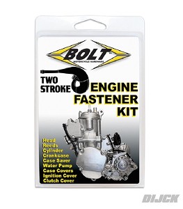 BOLT Engine Fastener KitKAWASAKIKX65 00-22KX80 88-00 KX85 01-22KX100 95-22Kawasaki Engine Fastener KitOur Two-Stroke Engine Fastener kits have all the external fasteners from top to bottom-end including hardware for:- Heads- Reeds- Cylinder- Crankcase- Case Saver- Water Pump- Case Covers- Ignition Cover- Clutch CoverDoes not include engine-to-frame mount bolts.Blokbouten, Blokboutenset