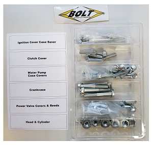 BOLT Engine Fastener KitKTMSX250 23-26EXC250 24-26EXC300 24-26HUSQVARNATC250 23-26TE 250 24-26TE300 24-26GASGASMC250 24-26EC300 25-26KTM Engine Fastener KitOur Two-Stroke Engine Fastener kits have all the external fasteners from top to bottom-end including hardware for:- Heads- Reeds- Cylinder- Crankcase- Case Saver- Water Pump- Case Covers- Ignition Cover- Clutch CoverDoes not include engine-to-frame mount bolts.Blokbouten, Blokboutenset