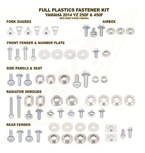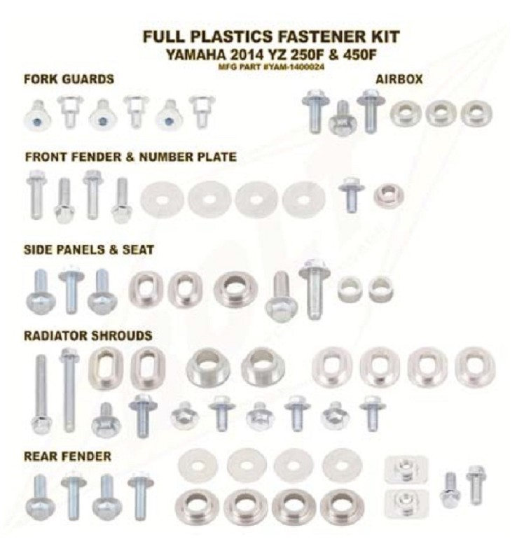 Factory style hardware to fasten the front fender, number plate, fork guards, radiator shrouds, seat, rear fender and side panels for the model listed above. Includes bolts, washers, nuts, and aluminum bushings. Satisfaction Guaranteed!!!