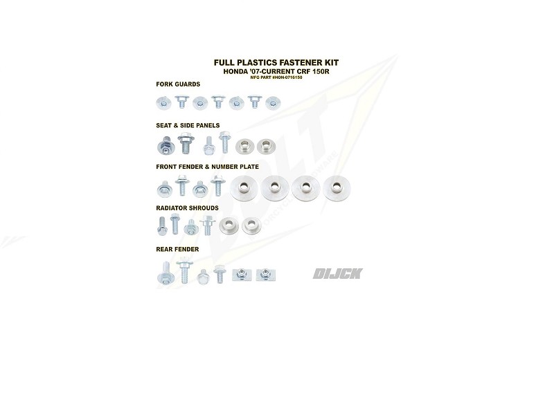BOLT Full Plastic Fastener kit CRF150 07-20Honda Full Plastics Fastener KitWe have done the research for you and put together a fastener kit with all the factory style hardware you need to fasten your front fender, number plate, fork guards, radiator shrouds, seat, rear fender and side panels. Satisfaction guaranteed.This kit fits multiple models/years. There may be components in this kit that do not apply to your specific model.Our hardware meets or exceeds OEM specs. Proudly designed and assembled in the USA with components from the USA & Taiwan.