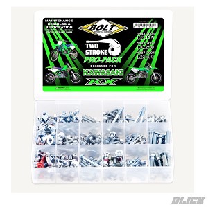Description: This Two-Stroke Pro-Pack is designed for maintenance, rebuilds, and restoration of KX125/250/500. Includes engine hardware, bodywork fasteners, a full set of sprocket bolts, chain adjusters, rotor bolts. OEM style fasteners for fork & axle clamps, chain sliders, lower subframe, radiators, rear brake, handlebar controls, triple clamps, pipe & silencer, and thread chasers. Organized container includes a placement guide. Fits Kawasaki models: 1988-2005 KX125, 1988-2007 KX250, 1987-2004 KX500