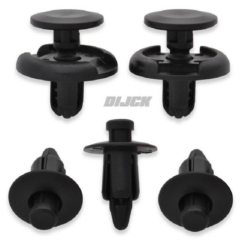 10 Pack of M7 removable, reusable, black nylon push rivets. This package contains five (5) of the M7 three-stage push rivets and five (5) of the M7 pry rivets. Also called sportbike fairing clips, plastic ATV fender rivets, or plastic motorcycle clips.