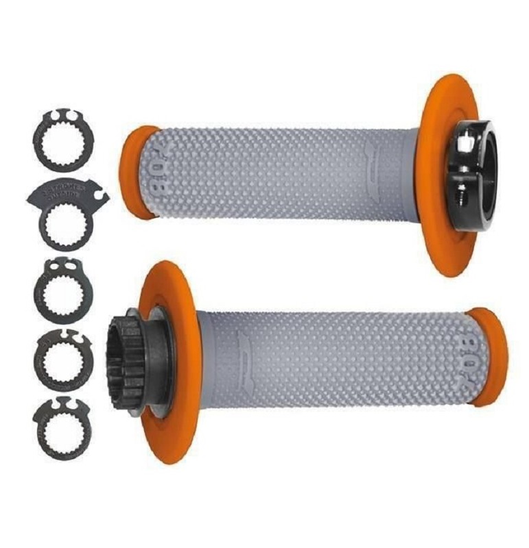 PRO-GRIP 708 Lock On Grips Orange GreyGeen lijm of binddraad nodig !!Deze handvaten zitten geschroefd op het stuur wat montage zeer gemakkelijk maakt.Lock-On grips worden geleverd met 5 verschhillende cams, dat maakt dat deze passen op alle modellen van 125cc t/m 500cc.Te gebruiken op zowel 2-Takt als 4-Takt motoren !Pro Grip Partnumber: PA070800ARGR