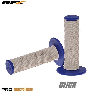 RFX Pro Series Dual Compound Grips Blue Ends (Blue/Grey)Product DescriptionRFX Grips are manufactured from high spec synthetic Kraton Polymer and feature the vibration reduction benefits and stickiness of natural rubber but resist damage caused by sunlight and chemicals that occur with natural rubber.RFX Grips feature a dual density design which allows for an external 60 SA compound that is more durable and resists crash damage. Yet has a soft centre 25 SA compound grip area for the best vibration resistance and comfort available.RFX Grips use the industry standard half waffle design with a level RFX Logo on the palm, this upper diamond and lower waffle design gives the best combination of palm area comfort and lower grip for muddy conditions. Dual Density Grip Features- Made using high spec synthetic Kraton Polymer for the ultimate sticky grip.- Dual Compound tool design allows for the best combination of compounds.- 25 SA centre compound improves comfort and reduces vibration.- 60 SA end compound improves crash damage resistance.- Half Waffle design gives the best combination of grip and comfort.- Smooth diamond pattern and level RFX logo on the palm area offer excellent grip without sacrificing comfort and causing blisters.- Waffle design on the finger area gives the best grip available for muddy conditions- Available in 26 colour combinations.- Packaged in pairs for use with right hand twist throttle machines.Handvaten Handvatten Grips
