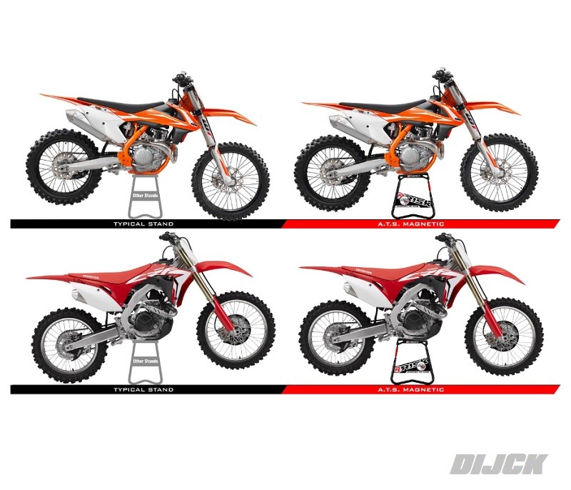 RISK ATS Adjustable Top Magnetic StandRISK ATS Verstelbare MotorsteunHet chassis voor elke crossmotor is iets anders ontworpen, en daardoor passen niet alle motoren op een traditionele crossmotorstandaard.De Risk Racing® A.T.S. Magnetische Moto Stand lost dit probleem op met een volledig verstelbare bovenkant, die ervoor zorgt dat elke motor waterpas staat.Het heeft ook ingebouwde magneten in beide zijpanelenRISK ATS Adjustable BikestandThe chassis for every dirt bike is designed a little differently, and as a result, not all bikes sit level on a traditional dirt bike stand. The Risk Racing® A.T.S. Magnetic Moto Stand solves this issue with a fully adjustable top, which ensures that every bike sits level. It also features embedded magnets into both side panels