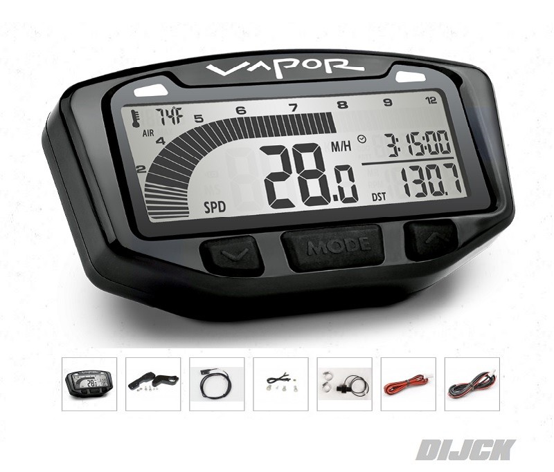 TRAIL TECH Vapor Computer STEALTH HondaCRF250 04-20CRF450 02-20CRF250X 04-20CRF450X 02-20CR500 95-02YamahaYZ125 95-20YZ250 95-20YZF250 01-20YZF400 98-99YZF426 00-02YZF450 03-20WRF250 99-20WRF400 98-00WRF426 00-02WRF450 03-20KawasakiKX125 95-08KX250 95-08KX500 95-02KXF250 04-20KXF450 06-20KLX300 95-08KLX400 00-18KLX450R 07-09SuzukiRM125 00-14RM250 00-14RMZ250 04-20RMZ450 05-20RMX450 17-18DRZ400 00-18GasGasSMR450 08-09SMR515 08-09HusqvarnaTE400 05-09TE450 05-09TE510 05-09TE610 05-09Description:* Vapor Digital Gauge Kit is carefully crafted and constructed for the off-road or on-road enthusiast from a combined effort of experts in software electrical and mechanical design.* Vapor 39 s large digital tachometer bar graph is easy to read and understand.*This digital gauge has many other useful features including speed engine temperature adjustable distance stopwatch and odometer.* Vapor also features two LED indicators for customizable shift indicators and engine temperature warning.Temperature:* Ambient temperature* Engine temperature* Dual programmable temp lights* Exact model fit temperature sensors* Selectable deg F/ deg C displayPower Input:* Included power connection fits all machines* Accepts any power input - AC/DC 6-400 VAC* Auto-switch to internal battery* Permanent memoryFeatures:* Custom design kits for exact model fit* One year warranty* Unlimited free Trail Tech phone and e-mail support* All parts included to complete installation* Waterproof connections* White backlit LCD display* Accessory dashboards for most applicationsSpeedometer:* Current speed* Maximum speed* Selectable MPH/KMPHDistance:* Adjustable distance* Permanent odometer* Selectable mile/kilometer displayClock:* Hour meter* Stop watch* Ride time* Accumulated ride time* Selectable 12/24 hour display* Lap timer* Permanent hour meter* Accumulated ride timeSKU: 752-119