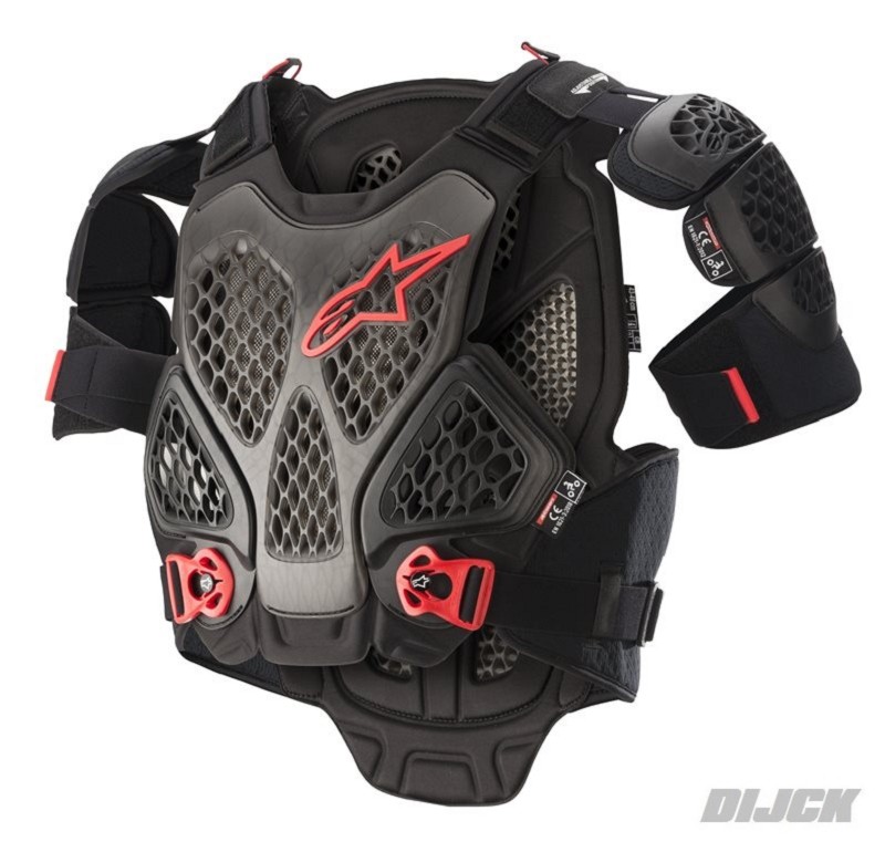 ALPINESTARS A-6 Chest Protector BLACK ANTHRACITE REDDescription- Chest and back protector plastic shells are constructed form a high-performance polymeric material blend for optimized flexibility and excellent weight saving properties- The plastic shells feature extensive, strategically-positioned perforation zones for excellent breathability and ventilation- The thermoformed padded chassis and padded side wings offer optimal rider comfort- An adjustable quick release waist system allows for a customized fit and ensures protection remains secure and close to the body at all times- The flexible front side wings are connected to the main chest protector with three bridge fixings allowing the wings to move independently and adapt to the natural contours of the body- Removable back puck for BNS compatibility- Silicon BNS pull tab for convenient and safe engagement of the BNS- The removable shoulder protectors allow this upper body protector to be worn in various configurations, giving the rider the opportunity to tailor the protector to the conditions- The removable shoulder protectors feature an adjustable V-Strap System to allow for a comfortable and snug upper arm fitmentALPINESTARS SKU: 67000221036, 6700022Bodybeschermer, Body Protector