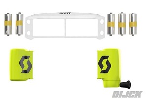 SCOTT Works Prospect / Fury Roll-off Kit Fluor YellowInclusief 5 rolletjes !!!De Scott Prospect / Fury crossbril start een nieuw hoofdstuk in een veelbewogen geschiedenis van Scott. Voortbouwend op 45 jaar ervaring, verlegt de Prospect grenzen van het gezichtsveld, comfort, lenzen, WFS technologie en nog veel meer!Prospect – Defend Your Vision’.50mm roll-off lint: het grootste zicht zelfs onder extreme omstandigheden.Anti-stick rooster met geïntegreerde modder flap: dé optimale oplossing voor roll-off lint zonder te plakken. Een groter lint vereist een opnieuw ontworpen en geoptimaliseerd anti-stick rooster met modder flap. In het midden van het rooster is een dunne verticale lijn toegevoegd, zodat het lint daar ook niet aan de lens vastplakt vanwege de lenskromming. De modderflap is gemaakt van transparant materiaal dat een groter gezichtsveld biedt.Click-On roll-off systeem: eenvoudige installatie zonder gereedschap. Het systeem kan heel eenvoudig op de Works pinnen worden bevestigd. Het rode hendeltje zorgt dat het systeem veilig vast zit.Dé ultieme Works technologie: switchen van roll-off naar tear-offs was nog nooit zó makkelijk!
