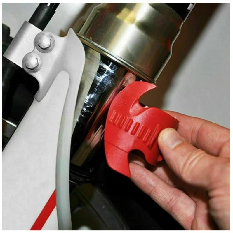 DIKE CLEANFORKLarge 45-55mmVoorkomt en repareert lekkende voorvorken in secondes! Klik de CLEANFORK simpel om de voorvork en draai. De meeste crossers hebben 1 á 2 keer per jaar last van een lekke vorkkeerring en zijn dan genoodzaakt om de voorvork naar een specialist te brengen of om zelf veel tijd en energie te steken in de reparatie, daarbij gebruik makend van duur speciaal gereedschap. De CLEANFORK lost dit probleem simpel op door het vuil te verwijderen wat de lekkage veroorzaakt.... En je kunt dit gewoon ter plekke doen tijdens de wedstrijd of training !* Bespaart geld, bespaart tijd en repareert de lekkage.* Haal de stofkap van de voorvork naar beneden, klik de CLEANFORK om de voorvork, draai deze 360 graden en haal de CLEANFORK dan naar beneden om het vuil te verwijderen.* Wordt geleverd met een aparte houder zodat je deze gemakkelijk en veilig op kunt bergen in de gereedschapskist.Prevents and cures leaky fork seals in seconds! Just snap them on your fork tubes and twist. Most dirt bike riders are faced with one or two leaky fork seals a season, forcing them to send their bike or suspension in for costly repairs or take time and energy fixing a fork seal on their own using expensive specialty tools and complicated suspension parts. The CLEANFORK simplifies the process by removing the dirt that typically causes a leaky fork seal...And you can do it right at the track or on the trail! * Saves money, saves time, and fixes leaks* Lower the dust seal, snap on the CLEANFORK, insert CLEANFORK into leady seal, twist 360 degrees, and pull down the CLEANFORK to remove dirt and grime* Comes with protective holder, so it can be stored safely in your toolbox or trail packVoorvork reparatie set, Reinigings Gereedschap voor de Voorvork, Cleaning Tool Front Fork 45mm, 55mmCross reference Partnumber Risk: Sealdoctor, Seal Doctor