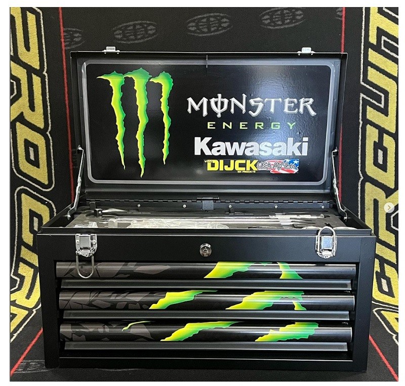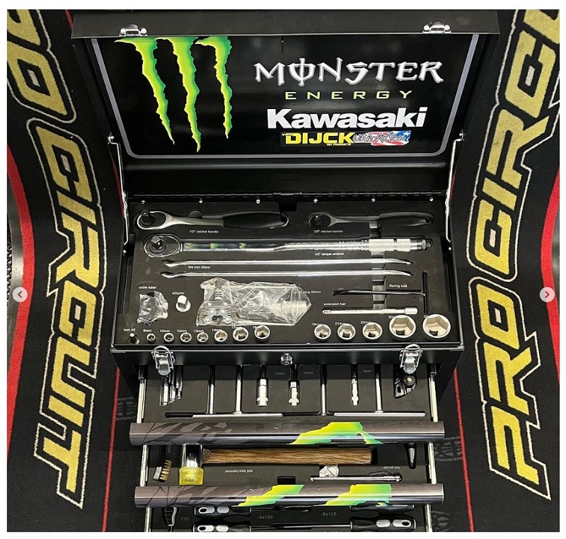 MX Toolbox 65 Pieces For Motocross Limited Edition MONSTER ENERGY/KAWASAKIOmschrijvingGereedschapskist MX Toolbox compleet speciaal moto met 65 stuks.Er zijn alle specifieke gereedschappen voor een racemotormonteur, Torc-sleutel, T-handgreepset...Zie details op de foto'sDescriptionTool box MX Toolbox complete special moto with 65 pieces. There's all specicif tools for a race motorcycle mechanic, Torc wrench, T handle set...See details on the pictures
