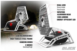 Features: - 1200 lumens - Micro-USB rechargeable - Dual Focus Lens - 4 light modes (high, medium, low, strobe) - Steel exoskeleton - Universal tripod mount - Lightweight with hanging hook