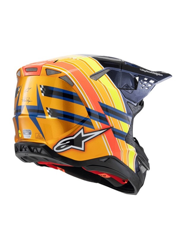 ALPINESTARS S-M10 TLD Edition DARK BLUE / ORANGE / YELLOW FLUO / RED GLOSSYbeschrijvingHet doel van de Alpinestars Supertech-familie van helmen was om de meest geavanceerde, beschermende en prestatieverhogende helmen mogelijk te maken voor rijders wereldwijd. Met de S-M10 heeft het Helm Ontwikkelingsteam van Alpinestars de helm ontworpen om de perfecte mix van uitstekende ventilatie en ongeëvenaard comfort te bieden, om een helm te creëren met het lichtst mogelijke gewicht, zonder concessies te doen op enig ander front.Het ontwerp van de S-M10 biedt een glad, aantrekkelijk, aerodynamisch profiel dat gestroomlijnd is en vrij van externe kanalen en kenmerken die als belastingpunt kunnen fungeren bij een impact of de algehele integriteit van de helmconstructie kunnen compromitteren. De oppervlaktecurvatuur bevordert verminderde wrijving bij impact, waardoor afbuiging en de meest efficiënte overdracht van energie mogelijk zijn om het hoofd van de rijder te beschermen tegen directe kracht op de schedel en doorverwezen naar de nek en wervelkolom.Partnumber: 83003257156