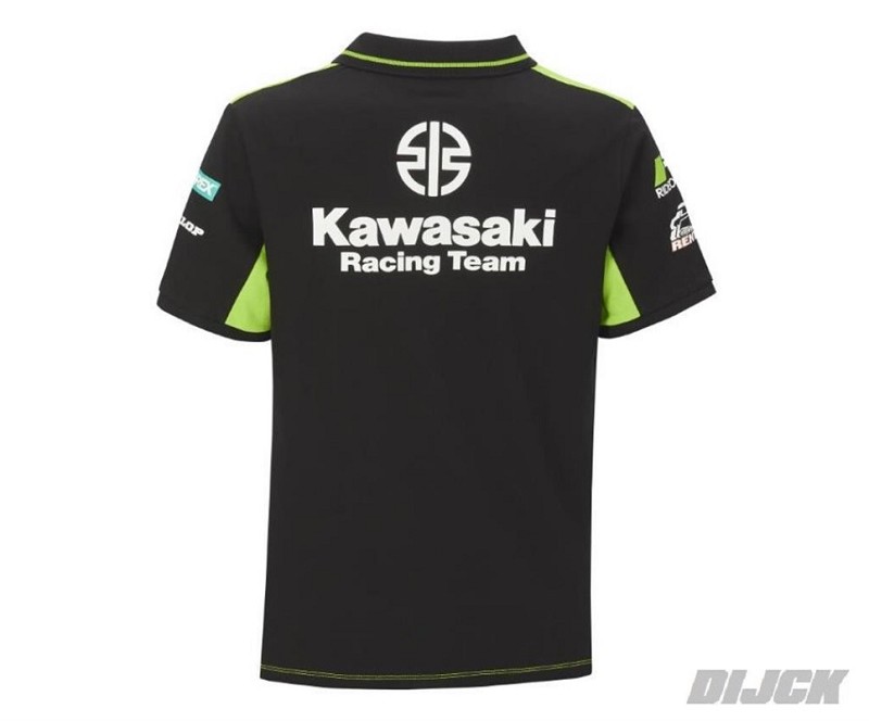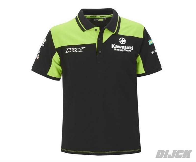 KAWASAKI OEM Polo Team MXGPSize XXLKawasaki green and black short sleeved polo shirt with 3-button neck opening and cuffed sleeves.- Kawasaki racing and sponsor logo’s- Pique fabric- 95% polyester 5% ElastanePartnumber: 139MXM22102L