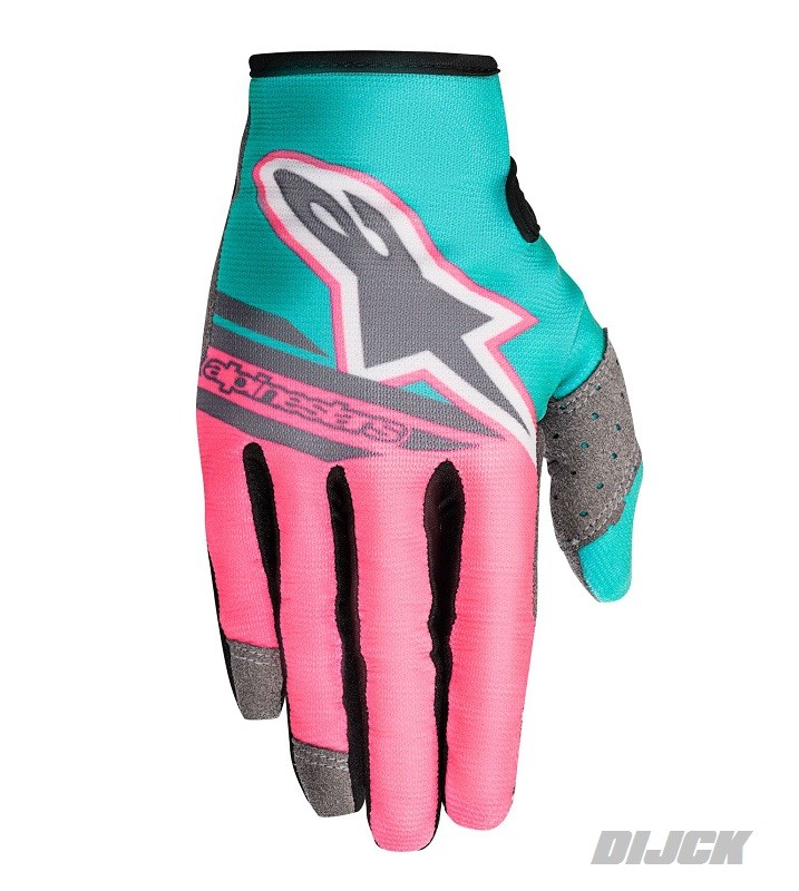 ALPINESTARS Radar Fkight Gloves Indy Vice Size XXL50% Korting !!Colour: Grey Pink TurquoiseDescription:• Ergonomic chassis and reduced material design for a supremely lightweight, comfortable glove.• Lightweight, single-piece spandex upper construction gives excellent flexibility.• Perforated single layer Clarino palm is breathable and offers excellent sensitivity on bikes controls.• Reinforced thumb construction increases durability and gusset for improved flexibility.• Innovative stretch insert in adductor (palm and thumb) for improved hand movement and lever control.• Clarino reinforcements on third and fourth fingers for added abrasion resistance.• Silicone grip patterning on fingers for improved riding control.• Velcro and spandex wrist pull tab with silicone for fit and easy entry.• Pre-curved finger construction reduces fatigue and improves comfort.ALPINESTARS Partnumber 35618189397