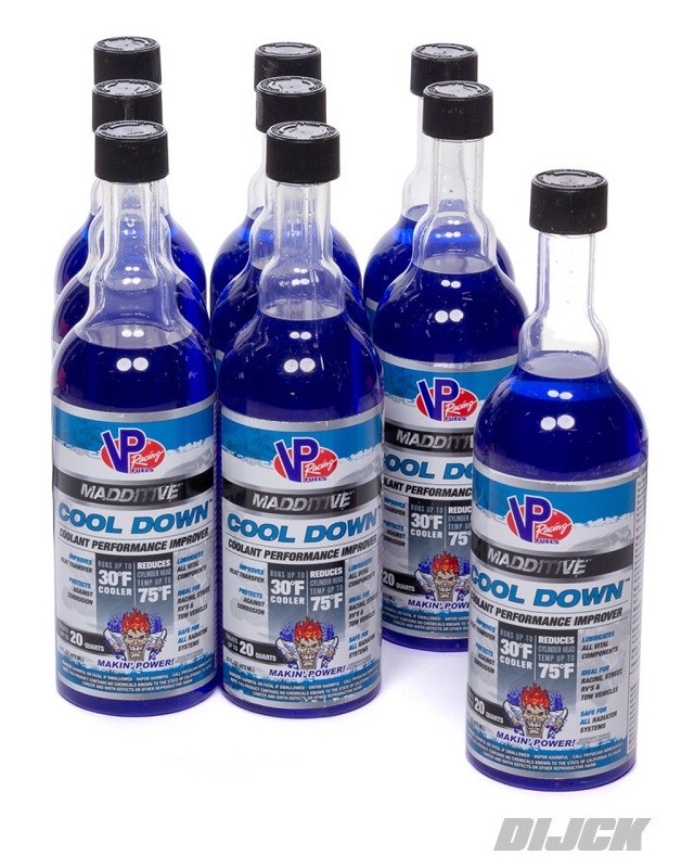 VP Racing Cool Down Coolant AdditiveVP Racing Cool Down Koelvloeistof ToevoegingVerpakking: 9x473mlGebruik: 60-100ml op 1 liter koelvloeistofOmschrijving:Cool Down™ verbetert de prestaties van uw koelvloeistof en is veilig voor alle radiatorsystemen — ideaal voor race-, straat-, en motocross voertuigen.Het verlaagt cilinderkoptemperaturen 10 tot 15° Celcius. Cool Down verhoogt de koelvloeistofstroom voor een betere warmteoverdracht, smeert alle vitale componenten en is goedgekeurd door de meeste race-sanctie-instanties.Een 473ml fles is voldoende voor koelsystemen tot een capaciteit van 12 liter. Voor toepassingen met gewoon water wordt een extra 50% meer Cool Down aanbevolen, terwijl voor dieseltoepassingen tweemaal de normale hoeveelheid nodig is.- Verlaagt de temperatuur van de cilinderkop 10 tot 15° Celcius.- Verbetert de koelvloeistofstroom voor een betere warmteoverdracht- Smeert alle vitale componenten- Beschermt gevoelige aluminiumlegeringenDescriptionCool Down™ improves the performance of your coolant and is safe for all radiator systems — ideal for racing, street, RV and tow vehicle applications. It reduces cylinder head temperatures 10 to 15° Celcius. Cool Down increases coolant flow for better heat transfer, lubricates all vital components and is approved by most race sanctioning bodies. One 16oz. bottle treats cooling systems of 12-20 quarts. For straight water applications, an additional 50% more Cool Down is recommended while diesel applications require twice the normal amount. - Reduces cylinder head temps 10 to 15° Celcius.- Improves coolant flow for better heat transfer- Lubricates all vital components- Protects sensitive aluminum alloysVP Racing Cool DownSKU: 2086