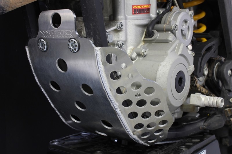 WORKS CONNECTION Extended Skid Plate EXC500 12-14•Unique Rubber Isolator Mounting System (RIMS) allows frame flex and rigidity properties to perform as the O.E.M. designed•CNC’d and formed from aircraft grade 6061 T-6 aluminum•Specific design and fit for each make and model •Narrow profile design coverage protects the frame rails and engine cases •CNC’d aluminum brackets with quality hardware for secure mounting•Skid Plate Foam included •Made in the USAPartnumber: 10638, 10-638