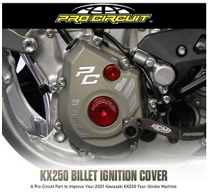 PRO CIRCUIT Ignition Cover KAWASAKIKX250 21-24Description:The new Pro Circuit Billet Ignition Cover for the 2021 KX250 is a direct replacement for the OEM cover and is much stronger than the stock part. This cover is CNC-machined from aircraft quality aluminum for strength and durability then anodized for surface hardness and reduced normal wear. A must-have for the serious rider, the Pro Circuit Billet Ignition Cover for the new KX250 will definitely offer that factory look.SKU: ICK21250