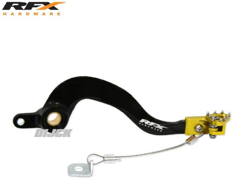 RFX Pro Rear Brake Pedal Black/YellowSUZUKIRMZ250 07-11RFX brake pedal- Brake arm is made of forged A2014 aluminum for durability.- Smooth surface design as OE brake arm.- Black anodized finish with laser print logo.- Brake tip is mode of CNC machined A7079 aluminum with anodized finish.- Bolt, pin and spring are made of stainless steel for less corrosion.- Comes with brake saver.Rempedaal