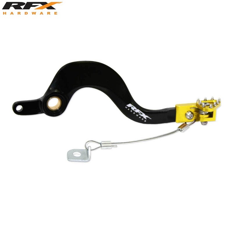RFX Pro Rear Brake Pedal Black/YellowSUZUKIRMZ250 12-22RMZ450 08-22RFX brake pedal- Brake arm is made of forged A2014 aluminum for durability.- Smooth surface design as OE brake arm.- Black anodized finish with laser print logo.- Brake tip is mode of CNC machined A7079 aluminum with anodized finish.- Bolt, pin and spring are made of stainless steel for less corrosion.- Comes with brake saver.Rempedaal