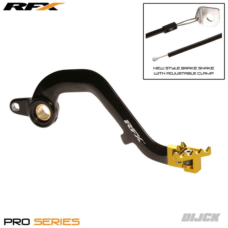 RFX Pro Rear Brake Pedal Black/YellowFlexi TipSUZUKIRM250 01-14Inclusive Brake Snakel- Brake arm is made of forged A2014 aluminum for durability.- Smooth surface design as OE brake arm.- Black anodized finish with laser print logo.- Brake tip is mode of CNC machined A7079 aluminum with anodized finish.- Bolt, pin and spring are made of stainless steel for less corrosion.- Comes with brake saver.RFX Partnumber FXRB_30500_99YLRempedaal