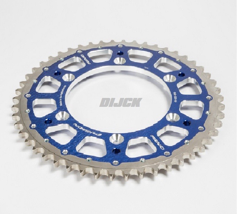 MINO Rear Sprocket Fusion BLUE 50TKTM 125-525 91-25HUSQVARNATC125 14-25TE125 14-25TC250 14-25TE250 14-25FC250 14-25FE250 14-25FC350 14-25FE350 14-25FC450 14-25FE450 14-25GASGASMC125 21-25MCF250 21-25MCF450 21-25TRIUMPHTF-X 250 24-.. TF-X 450 26-..Fusion Tandwiel met Stalen Krans