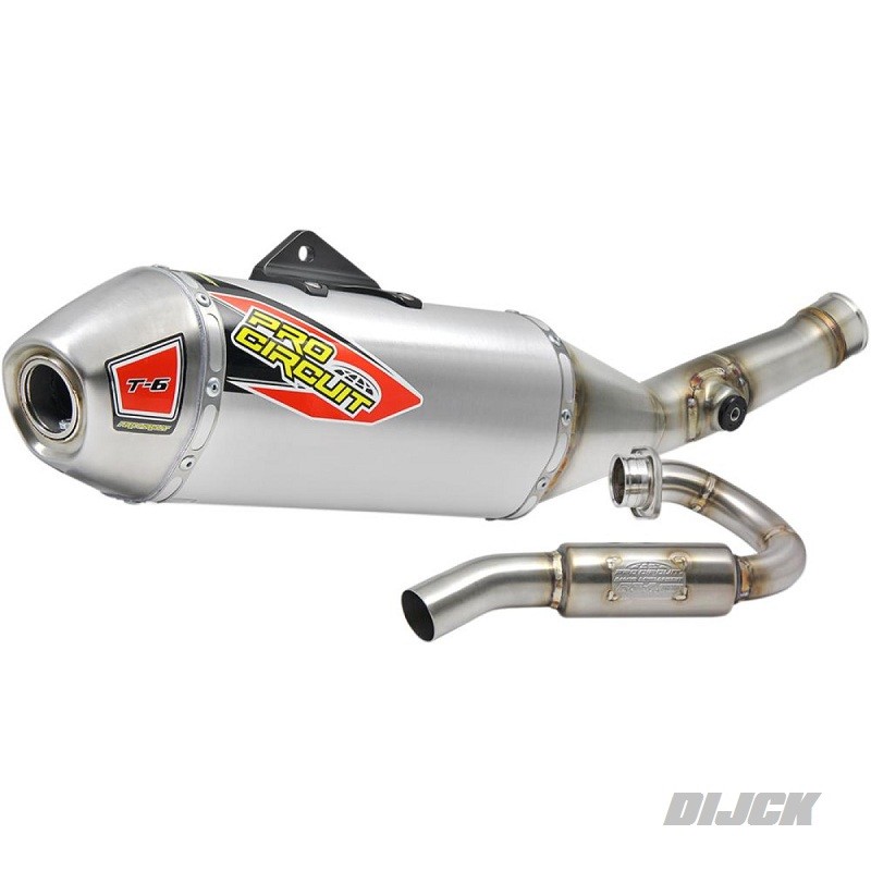 PRO CIRCUIT T-6 System with removable Spark ArrestorKAWASAKIKXF450 19-23Ready for Pro-Order !The T-6 Stainless Steel Exhaust System offers the same benefits as the Ti-6 Titanium Exhaust System, but the T-6 is constructed of stainless steel throughout the head pipe, mid pipe and end-cap while the canister is constructed of aluminum for increased durability and a more affordable alternative to titanium. Although the T-6 will not pass FIM sound requirements seen in professional racing here in the states or in Europe, the T-6 is still a great system for any off-road rider or closed course racer in terms of improved performance, durability and its inexpensive price tag. In addition to all of these features, the T-6 will come with a removable USFS approved spark arrestor making it easy for riders to alternate between off-road and closed course racing. Features Include: • Improves performance • Stainless steel construction throughout head pipe, mid pipe, and end-cap • Aluminum canister construction • Equipped with RC-4 Resonance Chamber to reduce noise output • Machined aluminum muffler bracket for increased strength and durability • Asymmetrical muffler configuration for increased packing volume • Machined mid pipe to head pipe joint for a better, leak free fit • Removable USFS approved spark arrestor • TIG precision welding • Made in the USASKU: 0121945G