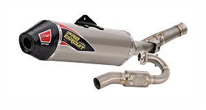The Ti-5 Exhaust System is constructed of titanium throughout the muffler can, header and mid pipe areas. Designed for optimum performance, riders will enjoy increased horsepower while still meeting the 2-Meter max sound requirements. Unlike other Pro Circuit exhaust systems, the Ti-5 offers consumers the choice between a titanium or carbon fiber end-cap. Additionally, the asymmetrical muffler configuration maximizes packing volume to ensure sustained performance