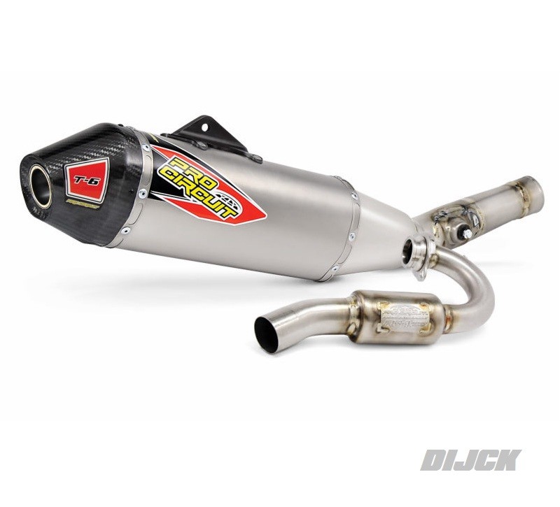 PRO CIRCUIT Ti-6 System Carbon EndcapKAWASAKIKXF250 21-24Exhaust Description: The T-6 Stainless Steel Exhaust System offers maximum performance and is constructed of stainless steel throughout the head pipe, mid pipe and end-cap while the canister is aluminum. The T-6 is perfect for any closed-course or off-road racer looking for improved performance, durability and a professional look. More features offered by the T-6 is the ability to meet AMA amateur racing sound requirements. Features Include:• Offers the same performance as the Ti-6• Stainless steel throughout head pipe, mid pipe and end-cap• Aluminum canister construction• Equipped with RC-4 Resonance Chamber• Machined aluminum muffler bracket for strength and durability• Asymmetrical muffler configuration for increased packing volume• TIG precision welding• Made in the USAPRO CIRCUIT Partnumber 0122125HSKU: 0122125H