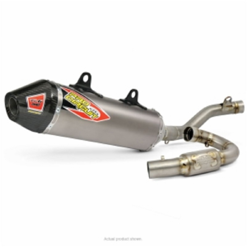 The Ti-6 Exhaust System is constructed of titanium throughout the muffler can, header and mid pipe areas. Designed for optimum performance, riders will enjoy increased horsepower while still meeting the 2-Meter max sound requirements. Unlike other Pro Circuit exhaust systems, the Ti-5 offers consumers the choice between a titanium or carbon fiber end-cap. Additionally, the asymmetrical muffler configuration maximizes packing volume to ensure sustained performance