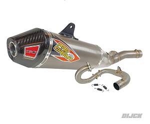 PRO CIRCUIT Ti-6 Titanium System Carbon End CapYAMAHAYZF450 23-25Exhaust Description:The Ti-6 Titanium Exhaust System is designed to improve performance and is constructed of titanium throughout the head pipe, mid pipe, and canister while the end-cap is constructed of carbon fiber. The Ti-6 is ideal for any closed-course or off-road racer looking for improved performance, durability and a professional look. Although the Ti-6 will not pass FIM sound requirements seen in professional racing here in the states or in Europe, the Ti-6 will meet AMA amateur noise requirements, and comes equipped with a removable USFS approved spark arrestor making it easy for riders to alternate between off-road and closed-course racing.Features Include:- Offering maximum performance while meeting AMA amateur noise requirements- Ideal for closed-course or off-road racing- Titanium construction throughout head pipe, mid pipe and canister- Carbon fiber end-cap construction- Machined aluminum muffler bracket for increased strength and durability- Asymmetrical muffler configuration for increased packing volume- Removable USFS approved spark arrestor- TIG precision welding- Made in the USAPRO CIRCUIT Partnumber 0332345F