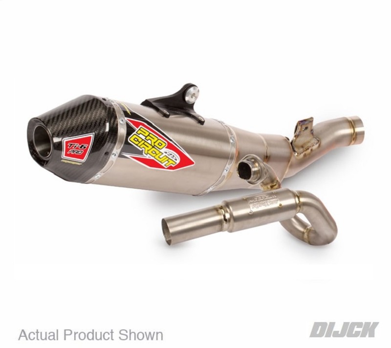 PRO CIRCUIT Ti-6 System with removable Spark ArrestorPRO System With Carbon End CapKAWASAKIKXF450 24-26Exhaust Description: Pro Circuit's Ti-6 Pro Titanium Exhaust System was created for professional racers competing in a series such as AMA Supercross or AMA Motocross to ensure they pass AMA/FIM sound regulations. The Ti-6 Pro Titanium Exhaust System is constructed of titanium throughout the head pipe, mid pipe, and canister while the end-cap is carbon fiber. The Ti-6 Pro is the next generation of professional level race exhausts. For the 2024 models, a rubber mount has been inserted into the bracket to help prevent potential cracking of the subframe.Features Include:- Passes AMA/FIM sound regulations- Improves performance- Titanium construction throughout head pipe, mid pipe, and canister- Carbon fiber end-cap- Equipped with RC-4 Resonance Chamber- Machined aluminum muffler bracket for increased strength and durability- Asymmetrical muffler configuration for increased packing volume- Machined mid pipe to head pipe joint for a better, leak free fit- Rubber bracket mount- TIG precision welding- Made in the USAPRO CIRCUIT Partnumber 0322445FPSKU: 0322445FP