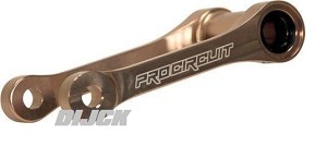 PRO CIRCUIT Linkage Arm KXF450 07-08 / KXF250 10-16Linkage Arm Description: Pro Circuit's Linkage Arms are CNC-machined from billet aluminum and are designed to stiffen up the initial linkage curve and improve the geometry of the chassis, making the bike much more stable. This will also help eliminate the initial loose and wallowy feel. Turning and cornering capabilities are greatly improved as well. Although having your suspension revalved by Pro Circuit would make a considerable improvement, the Linkage Arms alone provide a major improvement over the stock set-up. Each link arm includes all of the required bearings and seals. Pro Circuit Length for KX250F (10-14)/KX450F (07-08) is 132.5 mm. The stock length for the KX250F is 131.0 mm, and the stock length for the KX450F is 131.5 mm.