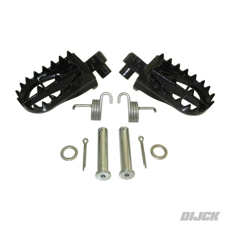 DIJCK Footpegs Steel BlackVoetsteunen Kit bestaat uit:- Voetsteunen- Pennen- Splitpenne- O-RingenYAMAHAYZ65 18-26YZ85 02-26YZ125 97-26YZ250 97-26YZF400 99-00YZF426 00-02YZF250 01-23YZF450 03-22Voetsteunen StaalCross Reference YAMAHA Partnumber:5ET-27411-00-005ET-27421-00-00