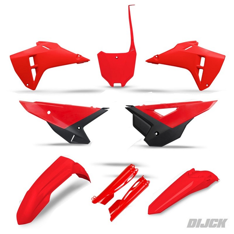 UFO Plastic Kit RESTYLE 2025 LOOKRed / Black Colour HONDACRF250 21-24CRF450 21-24Kit Includes:- Front Numberplate Red - Side Panels Red/Black - Radiator Scoops Red - Front Fender Red - Rear Fender Red - Airboxcovers Red - Fork Protector Red Partnumber: HOKIT129F999, HOKIT129F#999, HOKIT129F