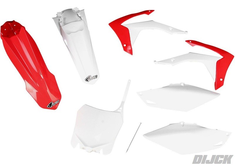 UFO Plastic Kit OEM Originele KleurstellingHONDACRF250 14-17CRF450 13-16 Kit includes:- Front Fender Red- Rear Fender White- Radiator Scoops Red/White- Side Panels White- Front Number Plate WhiteSKU: HOKIT116#999, HOKIT116999, HOKIT116