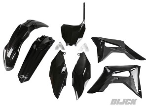 Kit includes: - Front Numberplate Black - Side Panels Black - Radiator Scoops Black - Front Fender Black - Rear Fender Black - Airboxcovers Black