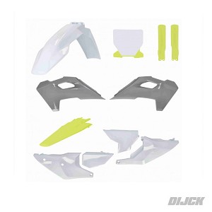 UFO Full Plastic Kit HUSQVARNAComplete Plastic KitInclusief VoorvorkkappenHUSQVARNATC125 23-24TC250 23-24TC300 23-24FC250 23-24FC350 23-24FC450 23-24Kit includes:- Front Fender White- Rear Fender Yellow- Radiator Scoops Grey- Side Panels White- Number Plate White / Yellow- Airbox Covers White- Fork Guards YellowSKU: HUKIT626#999D, HUKIT626999D, HUKIT626