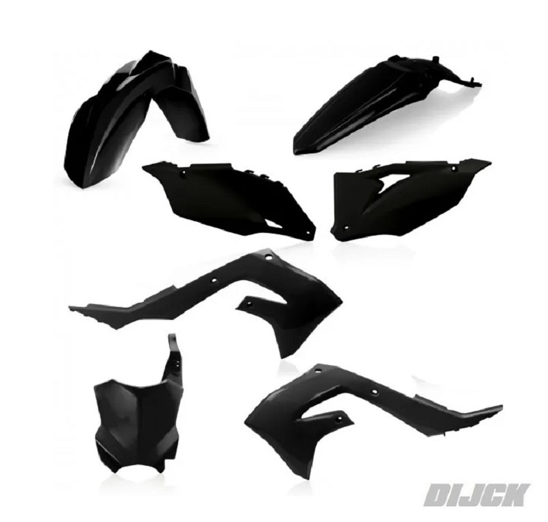 Kit bestaat uit: - Voorspatbord Zwart - Achterspatbord Zwart - Radiateurkappen Zwart - Zijschilden Zwart - Voornummerbord Zwart