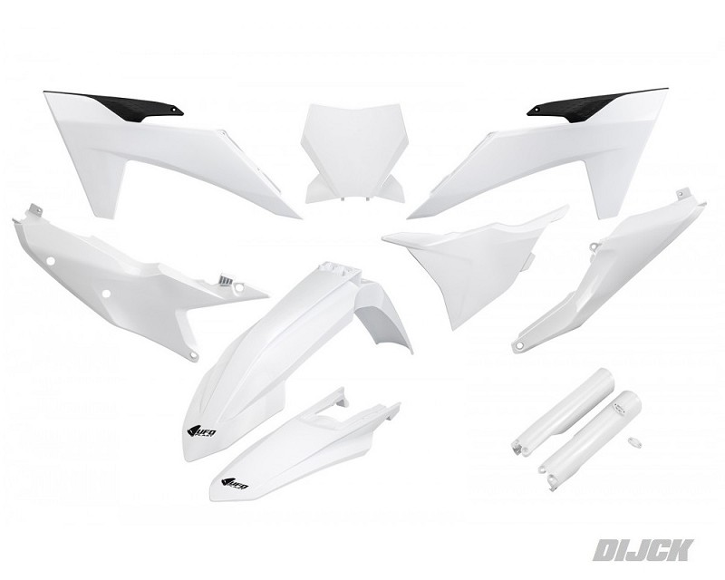UFO FULL Plastic Kit WHITEInclusief VoorvorkbeschermersKTMSX125 23-24SX250 23-24SX300 23-24SXF250 23-24SXF350 23-24SXF450 23-24Kit bevat de volgende delen:- Airbox Covers / Nummerborden- Radiateurkappen- Voornummerbord- Voorspatbord- Achterspatbord- VoorvorkbeschermersPlastic kit, PlastickitPartnumber: KTKIT529F-042, UKTKIT529WH, UKTKIT529F042