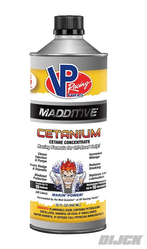 VP Racing CetaniumProductbeschrijvingCetanium® cetaanboosteradditief is een echte cetaanprestatieverbeteraar onder dieselbrandstofsupplementen. Het verhoogt het cetaangehalte van de brandstof tot 10 cijfers, reinigt injectoren en pompen en nog veel meer. Het is ontwikkeld om een ??explosie van vermogen en motorprestaties te bieden voor off-road dieselracemotoren en -toepassingen. Cetanium is niet alleen een hoogpresterend additief voor diesel-cetaan, maar het verbetert ook het aantal pk's en verhoogt het brandstofverbruik. Om nog maar te zwijgen van het feit dat ons dieselbrandstofsupplement de verloren smering vervangt, slib en afzettingen verwijdert en het roken vermindert. De meeste andere vergelijkbare merken bieden deze extra voordelen niet.Gebruik voor maximaal voordeel een blik van 0,95 liter om 35 liter dieselbrandstof te behandelen. U kunt ook meer dan 35 liter brandstof behandelen. Als u bijvoorbeeld het cetaangetal met maximaal 5 cijfers moet verhogen, gebruikt u een vol blik van 0,95 liter om 70 liter brandstof te behandelen.Productvoordelen- Verhoogt het cetaangetal tot 10 cijfers- Verhoogt het aantal pk's- Reinigt injectoren en pompen- Verhoogt het brandstofverbruik- Voorkomt sludge en afzettingen- Biedt bescherming voor biodieseltoepassingen- Vermindert roken- Vervangt verloren smeringProduct DescriptionCetanium® cetane booster additive is a true cetane performance improver among diesel fuel supplements. It boosts the fuel's cetane up to 10 numbers, cleans injectors and pumps, and much more. We design it to provide an explosion of power and engine performance for off-road diesel racing engines and applications. Not only is Cetanium a high-performance diesel cetane booster additive, but it also improves horsepower and will increase your fuel mileage. Not to mention, our diesel fuel supplement replaces lost lubrication, removes sludge and deposits, and reduces smoking. Most other similar brands don't provide these additional benefits.As has been noted, Cetanium is not intended for street-legal vehicles. It's for off-road applications only.For maximum benefit, use one 32-ounce can to treat 10 gallons of diesel fuel. You can also treat more than 10 gallons of fuel. For example, if you need to only boost cetane by up to 5 numbers, use one full can to treat 20 gallons of fuel.Product Advantages- Increases cetane up to 10 numbers- Boosts horsepower- Cleans injectors and pumps- Increases fuel mileage- Prevents sludge and deposits- Provides protection for Biodiesel applications- Reduces smoking- Replaces lost lubricationVP RACING SKU: 2865