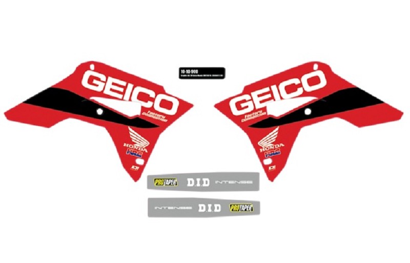 D'Cor Graphic Kit Team GEICOHONDACRF250 18-21CRF450 17-20Graphics Kit includes the following graphics:• Radiator Shrouds• Swing armsD'Cor Partnumber: 10-10-900, 1010900