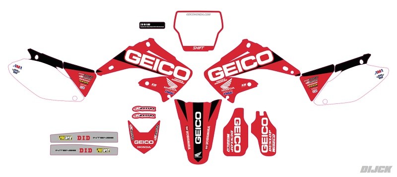 D'Cor Graphic Kit Team GEICO HONDACR125 04-08CR250 04-08Kit is inclusief stikkers voor:- Radiateur Kappen- Voorspatbord- Achterspatbord- Voorvorkkappen- Filterbak- Achterbrug- Nummerplaten, WITTE ondergrondD'Cor Partnumber: 20-10-500Stikkerset compleet
