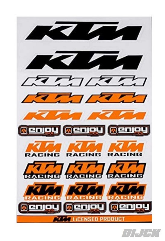 Enjoy Graphic Sheet Plakvel met diverse KTM Stickers.WhiteNew Enjoy Mfg KTM Racing OEM Sticker sheet.Very High Quality! Great for Bikes,Trucks,Tool Boxes Etc.- 23 Die Cut Stickers - 8 Mil scratch resistant adhesive backed vinyl- Clear coated to prevent fading - Full sheet measures 41x28 cmSKU: KTMSTICKERWHT