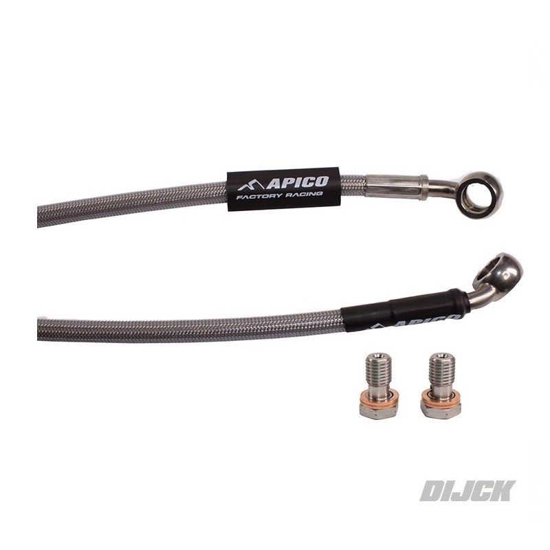 Description Apico Brake and Clutch Hose's are manufactured using only the very best quality braided material and are coated in durable plastic coating to add protection from roost, mud, sand, stones and water, Each Apico hose comes supplied with stainless steel banjo bolts and fittings.