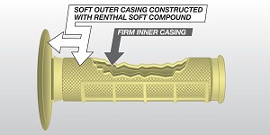 RENTHAL Grips Kevlar Dual Compound FijnPart Number: G165The most advanced grip available.Renthal has developed a special reinforced grip made with increased wear resistance. The grip has all the properties you would expect from a Renthal grip but with the life extending properties of KEVLAR® brand resin.The base material contains millions of randomly aligned KEVLAR® brand resin particles. As the grip is used more particles are exposed, so the number of particles at the grip surface increases.The result is revolutionary with the softest material we have ever produced which lasts three times longer than our current soft material. FeaturesRenthal Dual compound grips with DuPont™ Kevlar® brand resin are softer, tackier and longer lastingAvailable in tapered and standard dual compound patternsAs used by many of the top professional racers around the worldCovered by Patent GB2441015 Renthal dual compound Kevlar handvaten zijn gemaakt met behulp van miljoenen willekeurige uitgelijnd KEVLAR harsdeeltjes. Het materiaal profiteert van zijn zachtheid en duurzaamheid, waardoor je het comfort hebt van een zachte handvat, en de levensduur van een harde handvat. Maximale duurzaamheid wordt bereikt door gebruik te maken van onze stevige compound voor de binnenste delen van de grip, terwijl de contactgebieden van de rijder gebruik maken van de Aramid of zachte compound voor onovertroffen comfort en controle.AramidTackiness : * * * * *Strength : * * * * *Absorption : * * * * *Durability : * * * * *Handvat Handvaten Grips