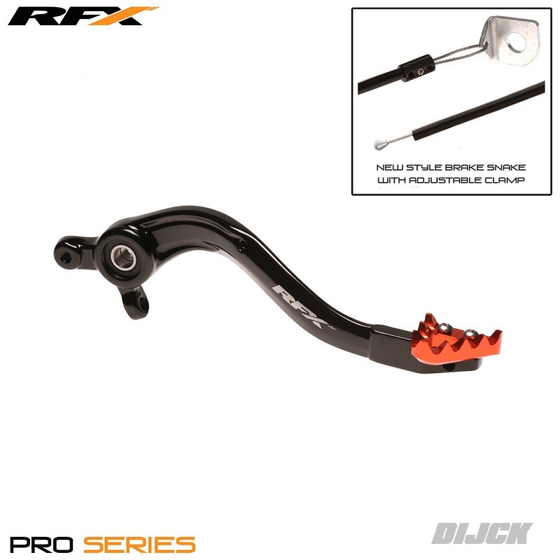 RFX Pro ST Rear Brake Pedal Black/OrangeSOLID TipInclusive Brake SnakeKTMSX125 16-22SX150 16-22SX250 17-22SXF250 16-22SXF350 16-22SXF450 16-22EXC125 17-22EXC250 17-22EXC300 17-22EXC-F250 17-22EXC-F350 17-22EXC-F450 17-22GASGASMC125 21-22MCF250 21-22MCF450 21-22RFX brake pedal- Brake arm is made of forged A2014 aluminum for durability.- Smooth surface design as OE brake arm.- Black anodized finish with laser print logo.- Brake tip is mode of CNC machined A7079 aluminum with anodized finish.- Bolt, pin and spring are made of stainless steel for less corrosion.- Comes with brake saver.RFX Partnumber FXRB 50401 99OR, FXRB5040199ORKTM Partnumber 55413050044, 7901305044, 79413050044Rempedaal