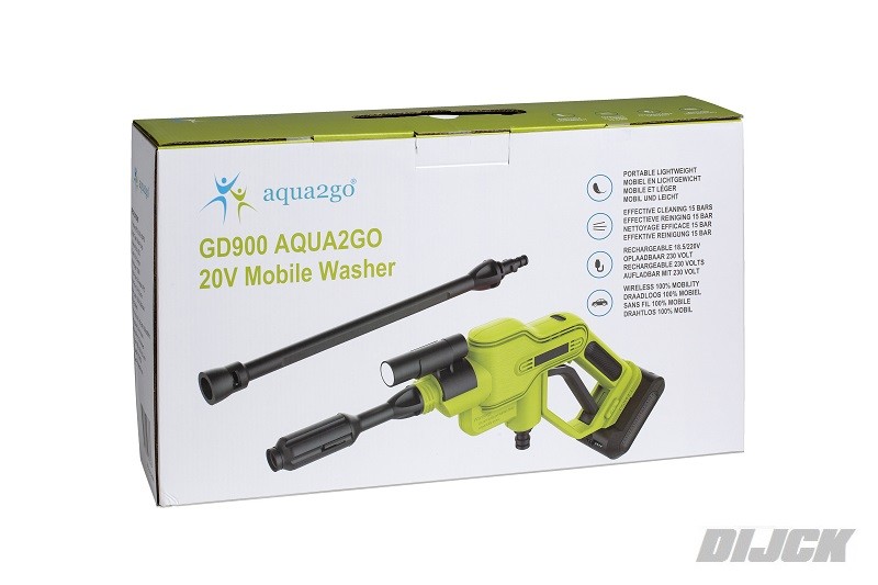 AQUA2GO 20V Mobile Washer Spray GunDraagbare HogedrukreinigerProductbeschrijvingDe Aqua2go GD900 draagbare hogedrukreiniger is zowel geschikt voor gebruik binnen als buitenhuis.Aqua2go GD900 draagbare hogedrukreiniger productkenmerken:* Laag waterverbruik & hoge waterdruk* Energiebesparend & milieuvriendelijk* Draagbaar, duurzaam, veilig & mooi design* Lichtgewicht en compact* Druk: 14-20 BAR* Spanning: 20V (DC)* Motorvermogen: 130 W* Debiet: 3,5 l/min* Ingang oplader: AC 100-240V 50hz/60hz* Laadtijd: 3,5-4 uur* Bedrijfsduur: 25 minuten* Afmeting: 458 x 208 x 83 mm* NETTO gewicht: 1,9 kgIn de verpakking:* Verstelbare spuitmond* Zaklamp* Verlenging spuitlans* Apparaat* Aanzuigslang 5,0 meter PVC* Afneembare lithium-ion accu 20V 2500mAh* OpladerSKU: GD900